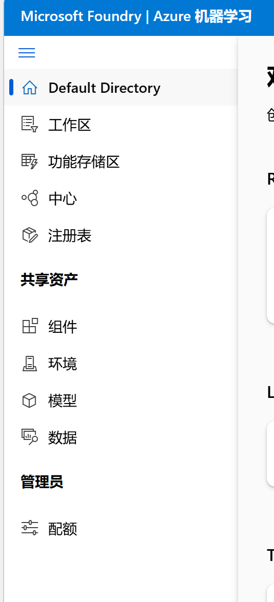 类似主页功能, 在 Azure 机器学习中,默认目录是你进行所有操作的基础环境。它包含了工作区、功能存储区、中心和注册表等核心组件。