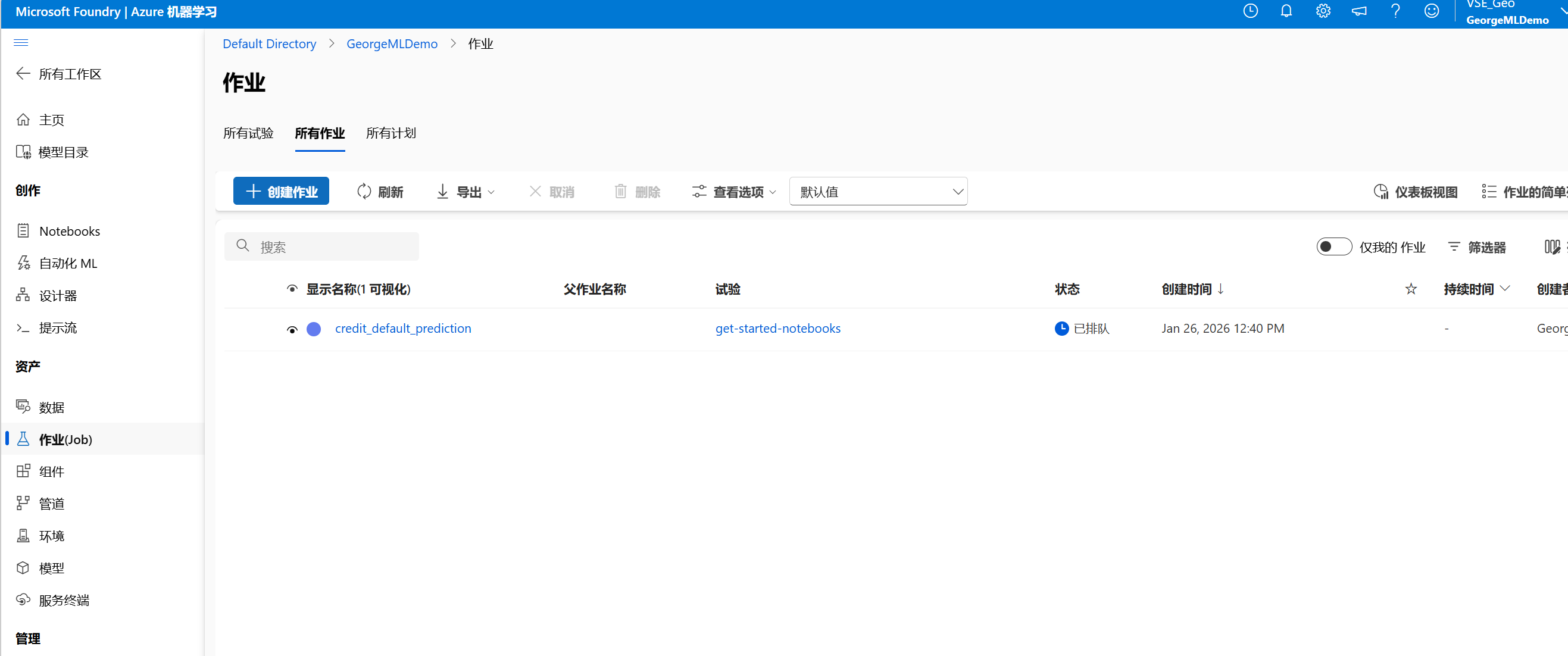 按照示例一步一步运行,然后可以看到在作业处已经生成了作业并排队。