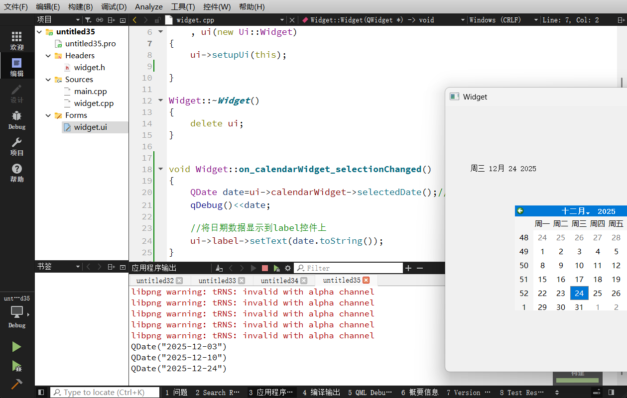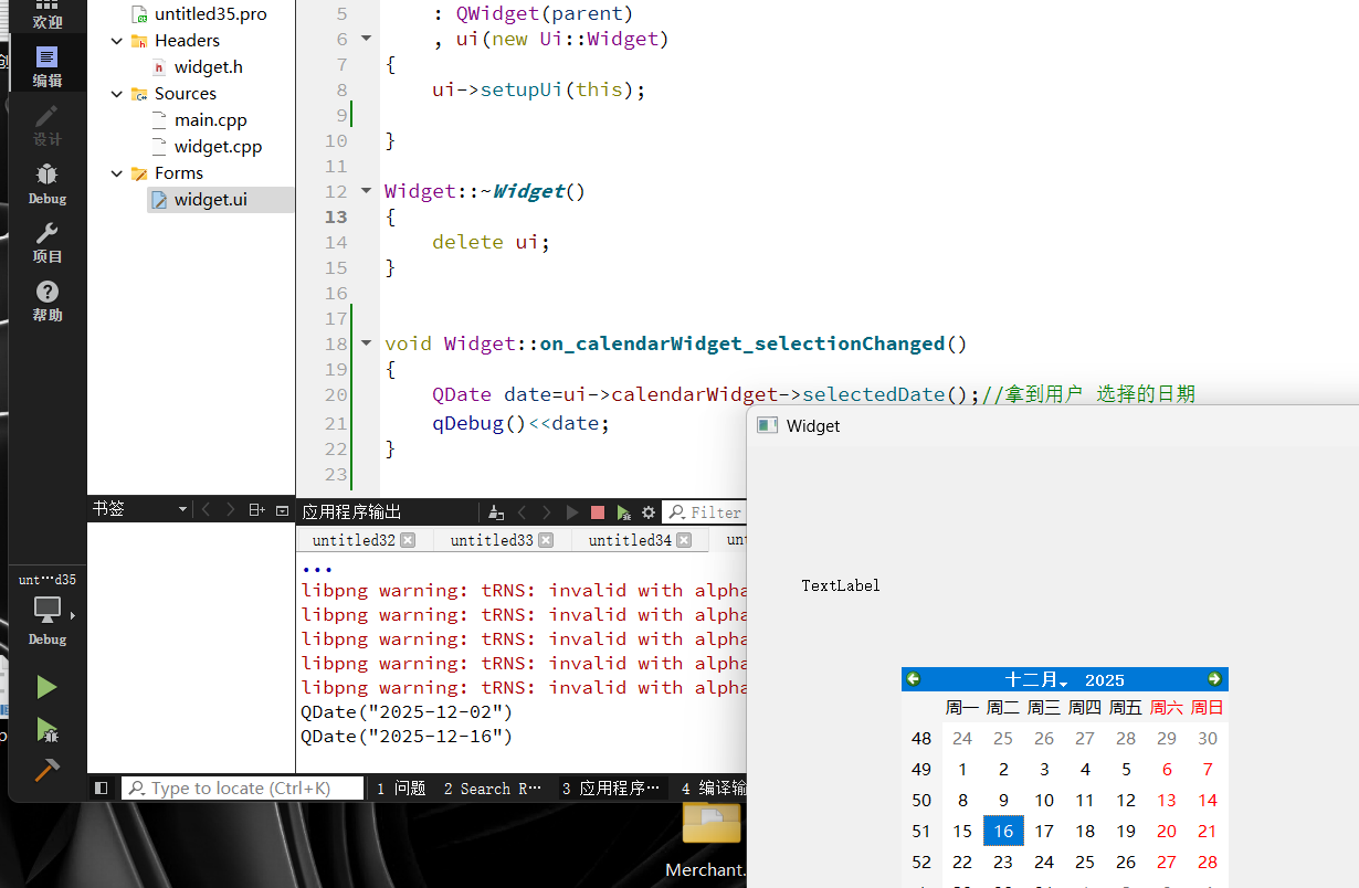 在槽函数中,通过调用selectedDate()方法获取当前选中的日期对象(QDate)。