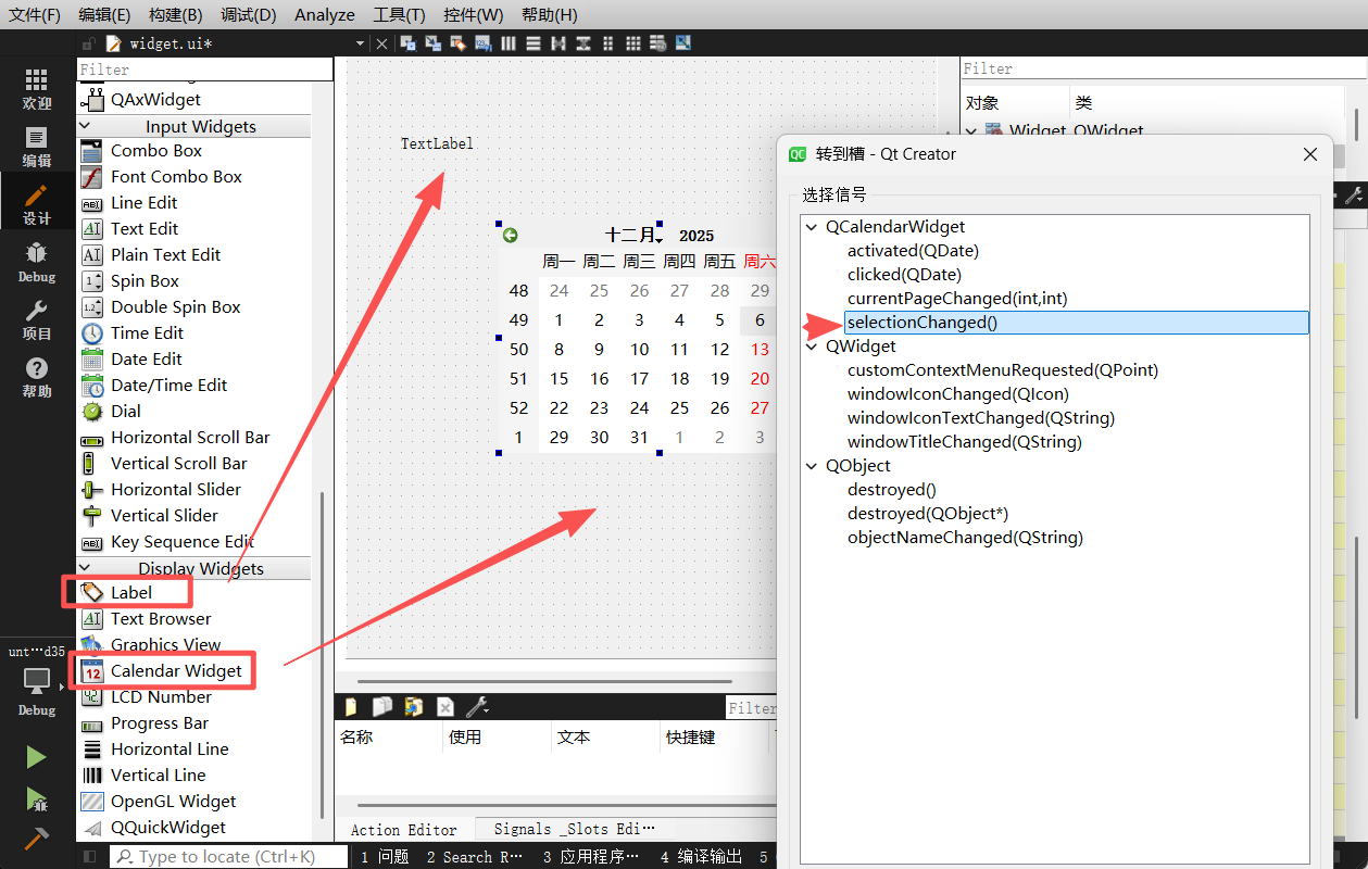 在UI中放置日历控件和一个用于显示的Label。日历控件最常用的信号是selectionChanged,当用户点击不同日期时触发。