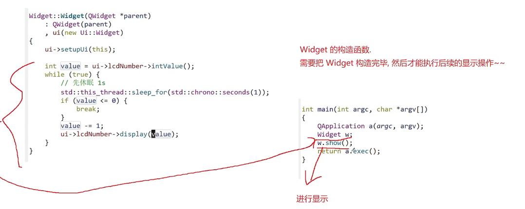这段代码会导致严重的问题。Qt的GUI运行在主线程中,show()方法展示窗口以及后续的事件响应(鼠标点击、重绘)都依赖于主线程的事件循环(a.exec())。如果在构造函数中进入死循环并休眠,主线程被阻塞,无法处理任何绘制事件,导致窗口无法显示,或者显示为白板,直到循环结束。