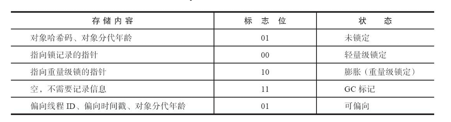 对象运行时数据如哈希码、GC 分代年龄、锁状态标志、线程持有锁、偏向线程ID 等,这部分在 32 位虚拟机和 64 位虚拟机分别占用 32 比特 和 64 比特,官方的称呼为 "Mark Word"。**Mark Word 被设计成一个动态定义的数据结构,根据对象的状态复用自己的空间。**例如在 32 位的 HotSpot 虚拟机中,如对象未被同步锁锁定的状态 下,Mark Word的 3 2个比特存储空间中的 25 个比特用于存储对象哈希码,4 个比特用于存储对象分代年龄,2 个比特用于存储锁标志位,1 个比特固定为 0,在其他状态(轻量级锁定、重量级锁定、GC标 记、可偏向)下对象的存储内容如表所示。