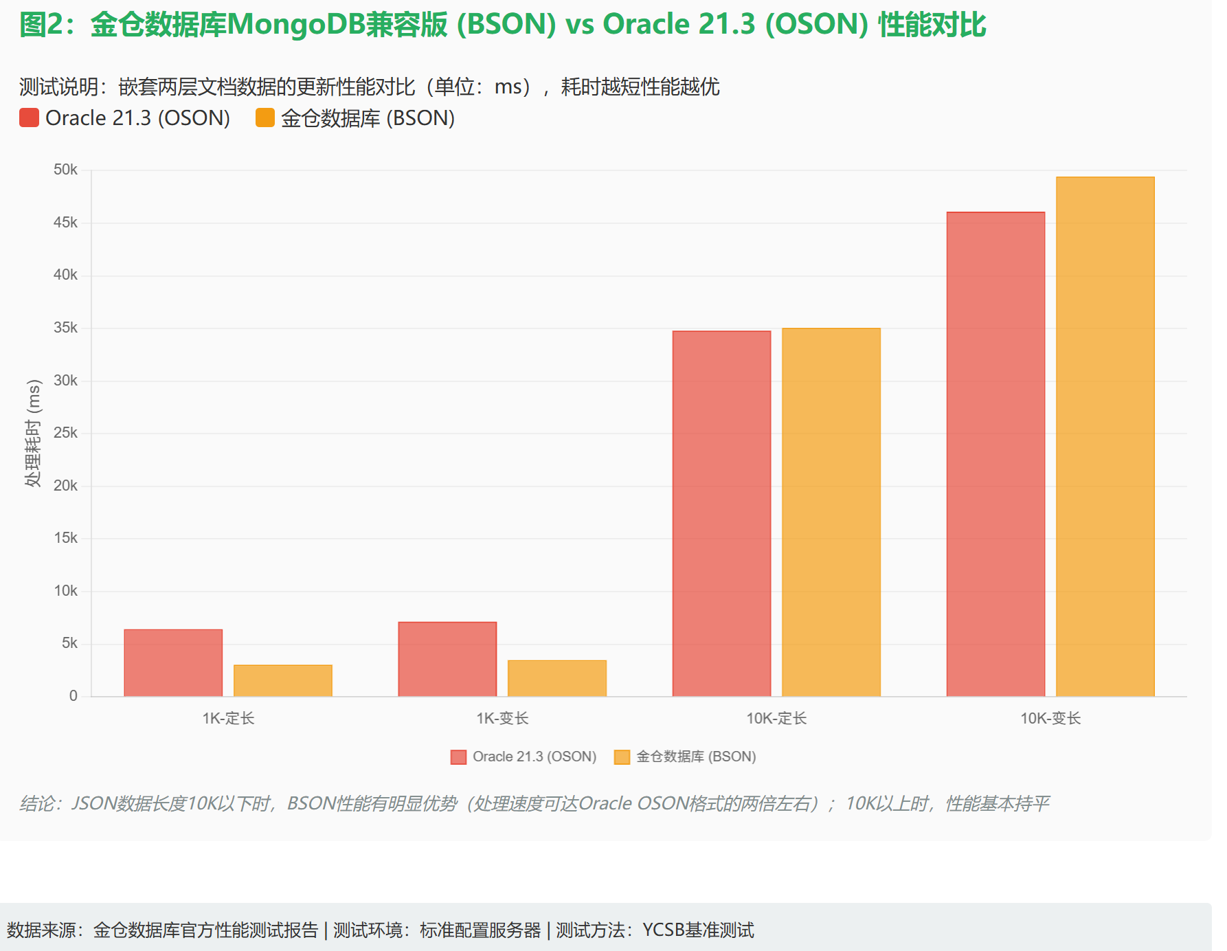 再把视角拉到另一边:面对以复杂 JSON 处理见长的关系型数据库巨头 Oracle,金仓数据库的 BSON 格式处理引擎同样不虚。在"更新嵌套两层文档数据"的测试里,当 JSON 数据长度较小时,金仓数据库的处理速度大约能达到 Oracle OSON 格式的两倍左右。这也说明了它在轻量级到中等复杂度的文档数据处理上效率很高,足以覆盖绝大多数业务系统对文档数据实时操作的需求,也为从 Oracle 生态迁移或融合提供了扎实的性能支撑。