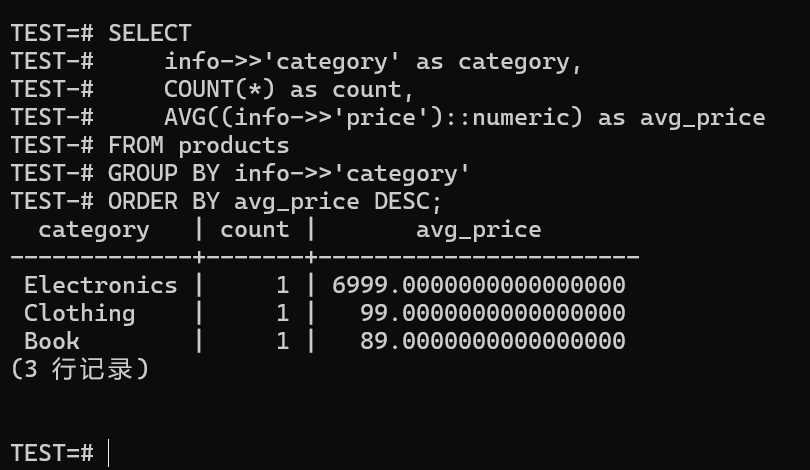 这里就能看到"多模融合"最过瘾的地方了:把 JSON 内部字段当成可分析的数据来做聚合统计,写法跟普通表没什么两样。