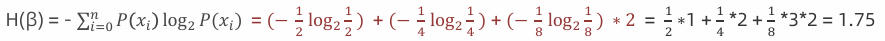 2:计算数据 β(AAAABBCD) 信息熵 其中A 出现的概率为1/2,B 出现的概率为1/4,C、D 出现的概率为1/8