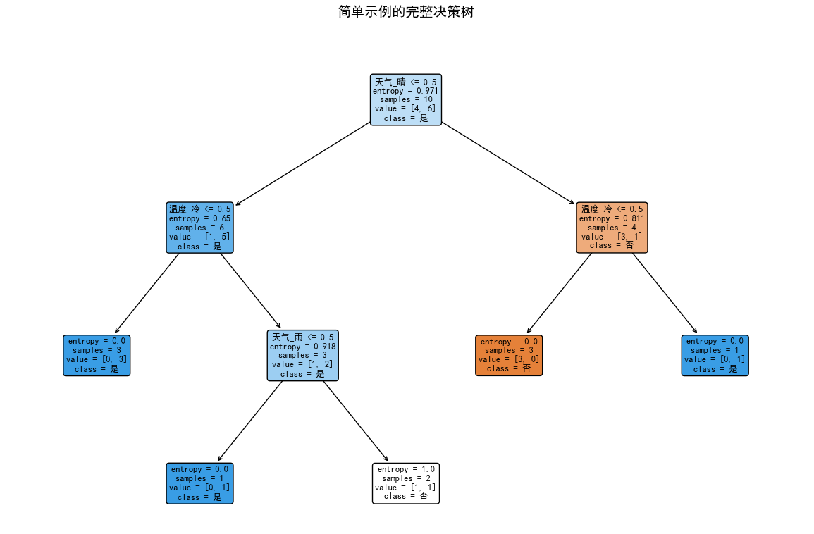plt.title("简单示例的完整决策树", fontsize=14, pad=20)