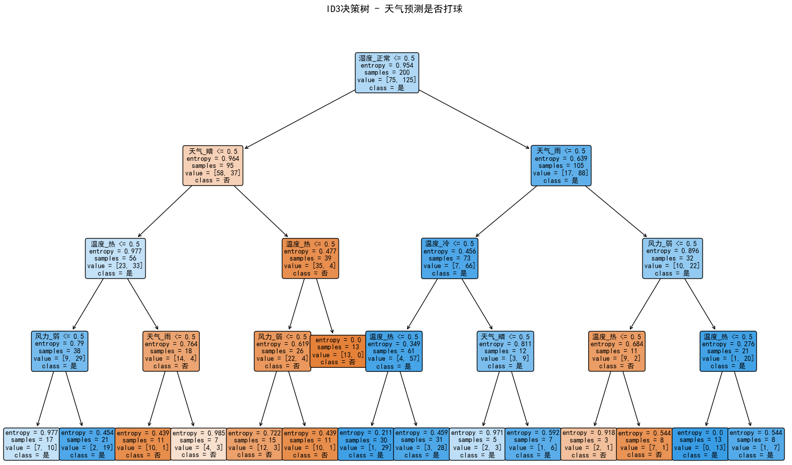 plt.title("ID3决策树 - 天气预测是否打球", fontsize=14, pad=20)