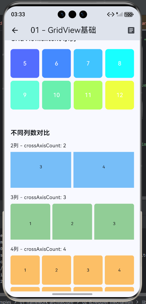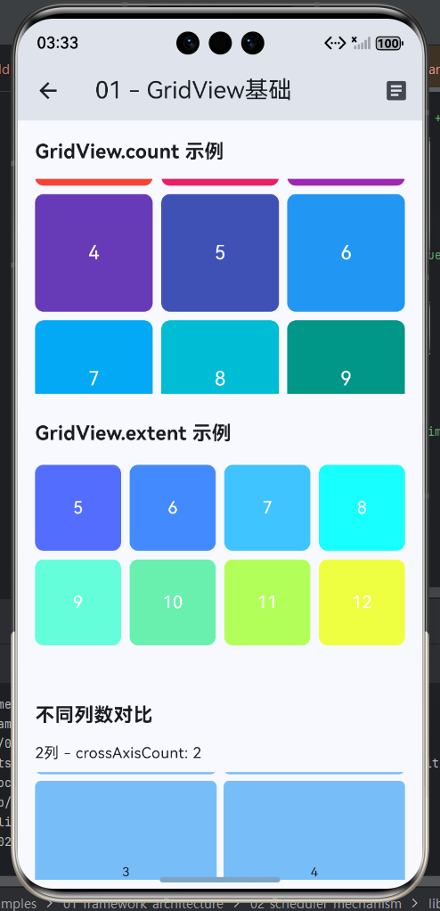 这是最简单直观的创建方式,只需指定crossAxisCount即可自动计算子项大小。适用于每个子项尺寸相同的场景,如颜色方块、图标网格等。crossAxisCount参数决定了交叉轴(垂直滚动时为水平方向)上子项的数量,系统会自动根据可用空间计算每个子项的具体尺寸。