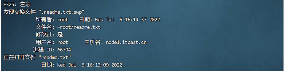 如果在打开某个文件时,弹出以上提示,那代表你这个文件之前没有保存就强制退出了,触发了Vim的备份机制,产生了一个xxx.swp交换文件。