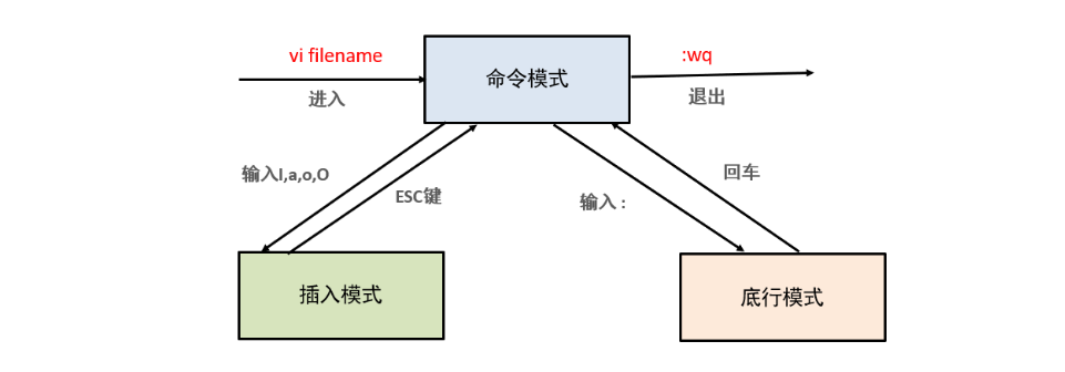 在Vi/Vim编辑器中,一共有3种工作模式:命令模式、插入模式(编辑模式)、末行模式(底行模式)