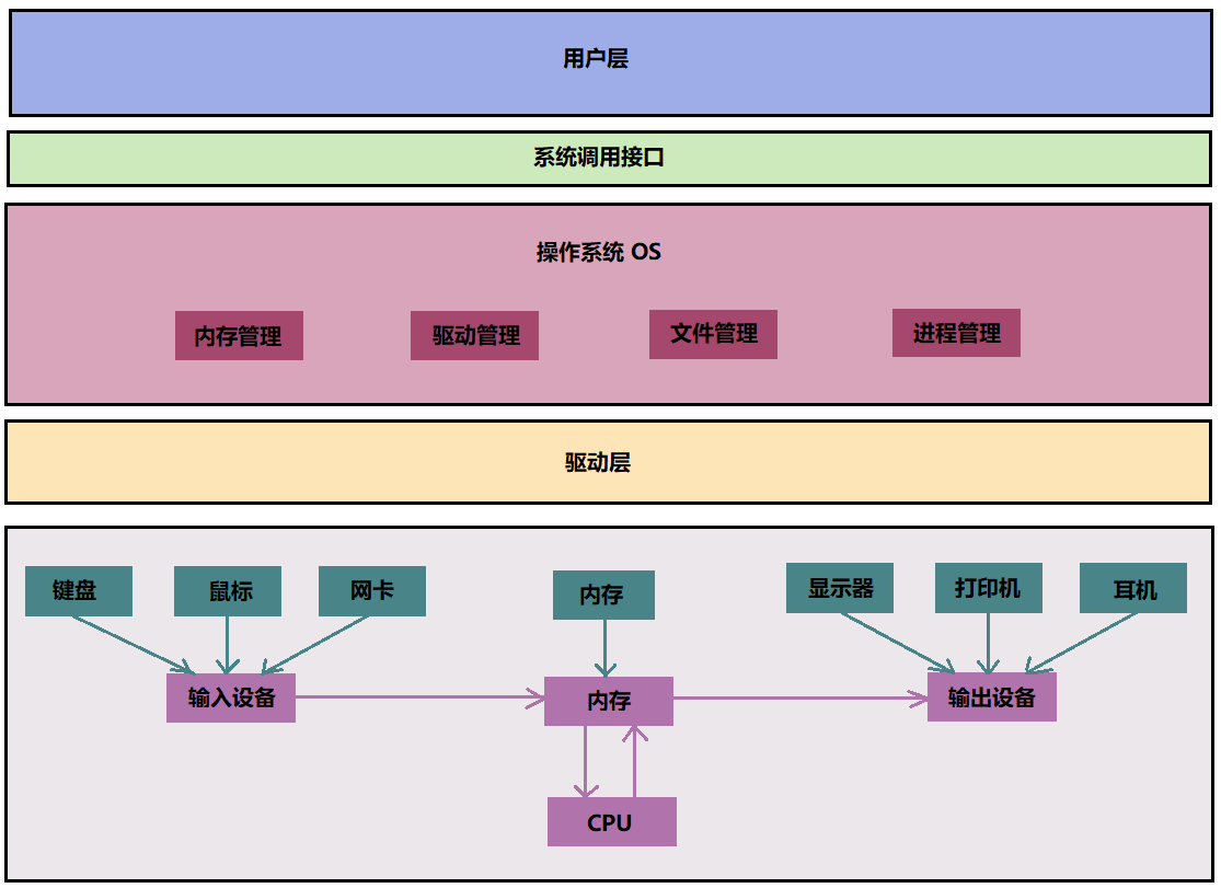 - 操作系统接口分为命令接口 (Shell)和程序接口(系统调用),前者面向普通用户,后者面向程序员;