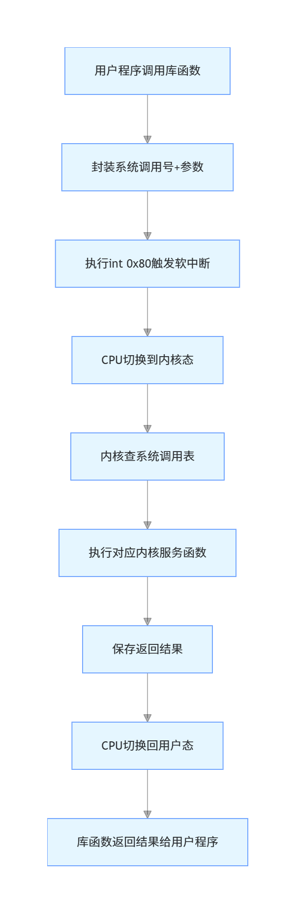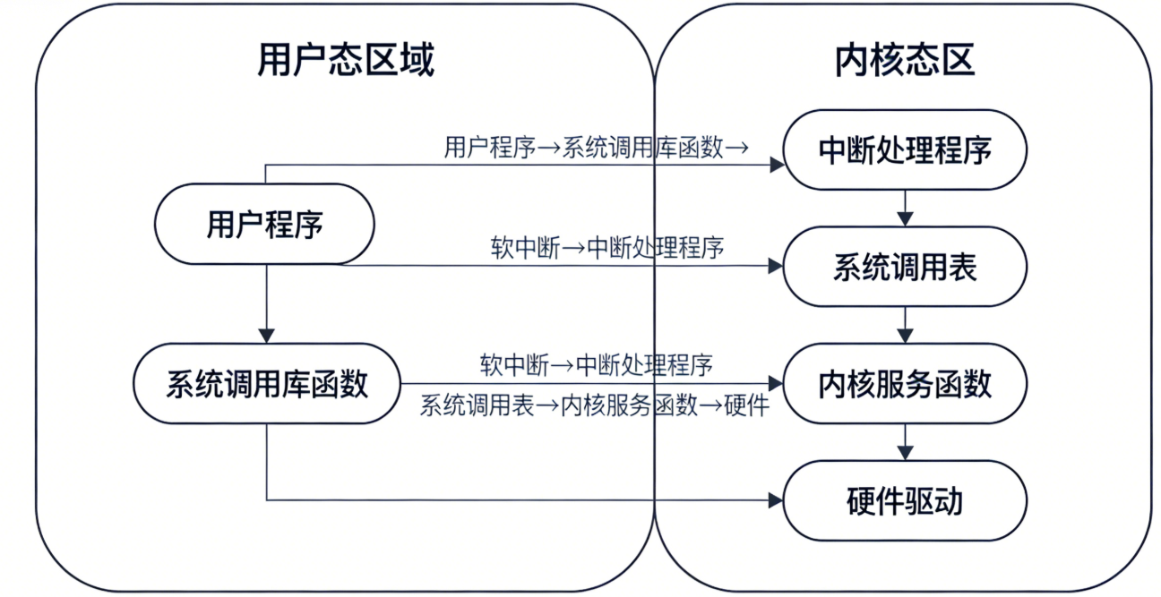 int 0x80触发软中断,CPU 切换到内核态; - 内核处理:内核根据系统调用号查找系统调用表,执行对应的内核函数;