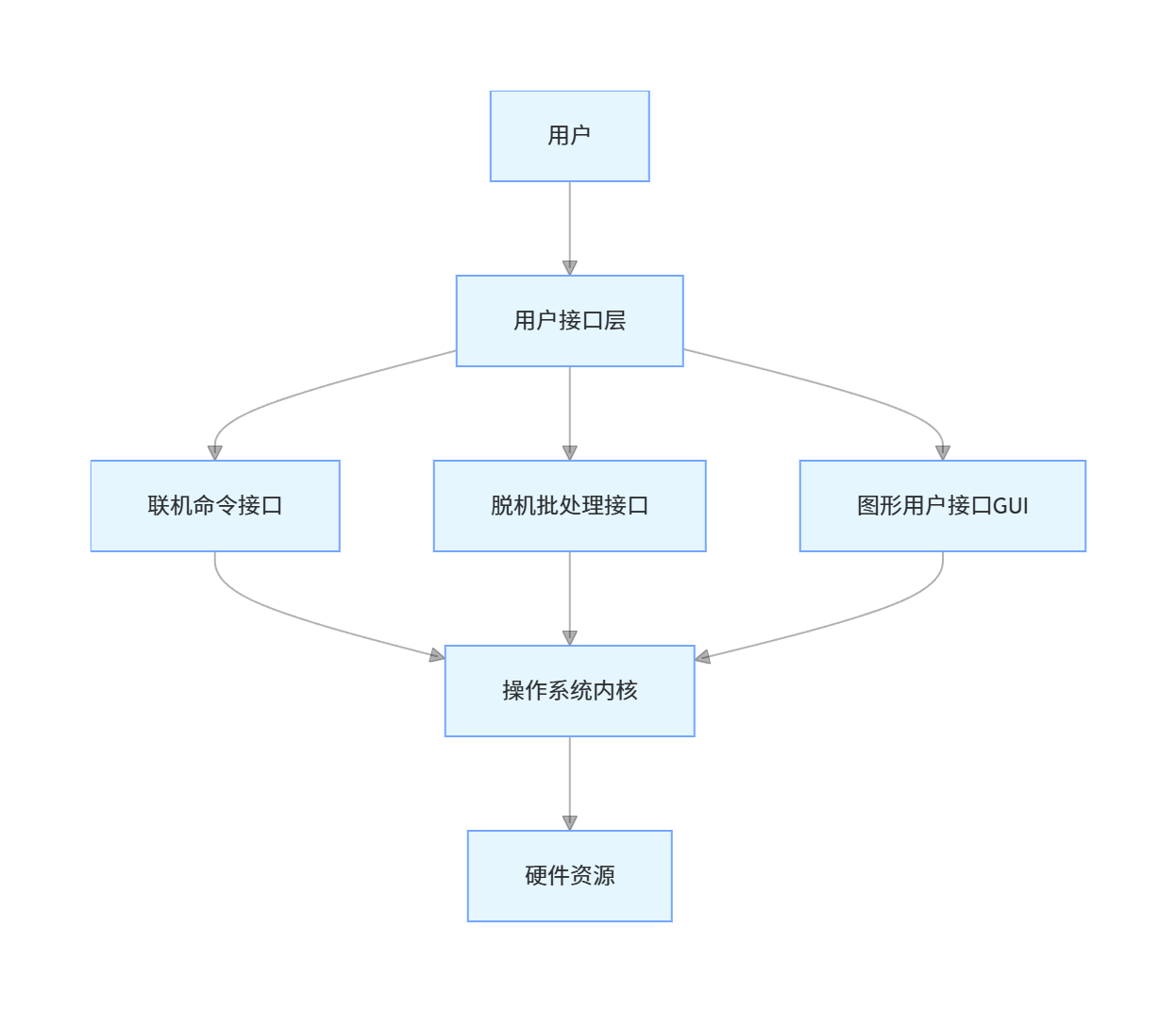 - 脱机用户接口(批处理接口):用户将作业需求写成批处理脚本,系统批量执行,无需实时交互。