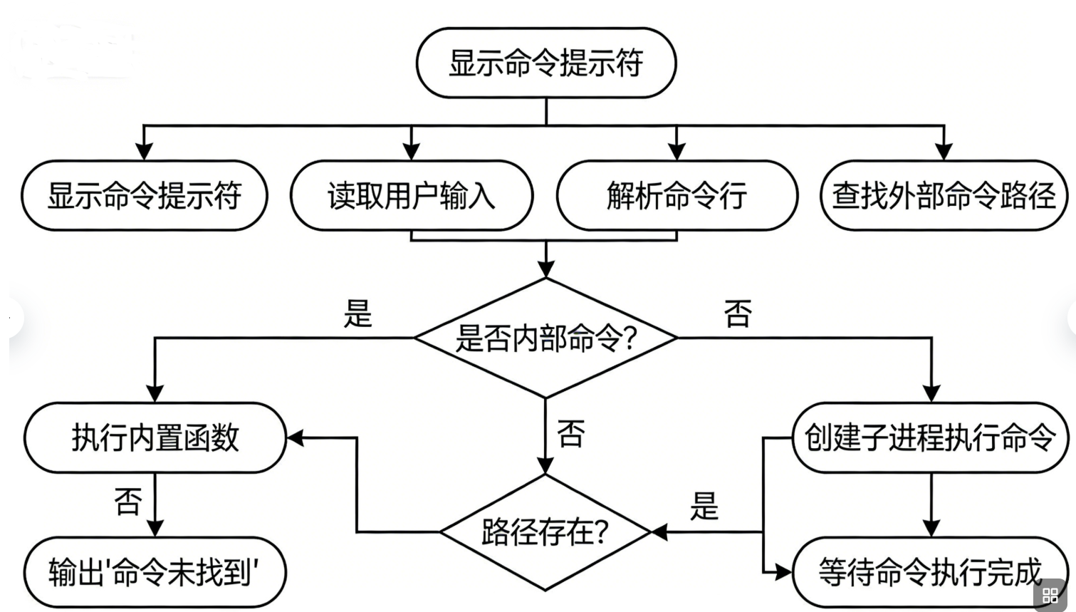 - Shell 的核心是命令解释器循环,通过创建子进程执行外部命令,内置命令直接在 Shell 进程中执行;