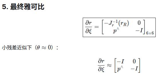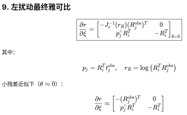 本文详细推导了分开形式的残差及雅克比左右扰动模型,经过这么多章节相似方法的推导,应该能发现一个现象,这种类型的推导,基本都是先定左右扰动模型,然后要么用一阶近似,要么伴随,构造BCH公式,这种位姿的融合讲解基本差不多了,下一讲应该是四元素或者实战了