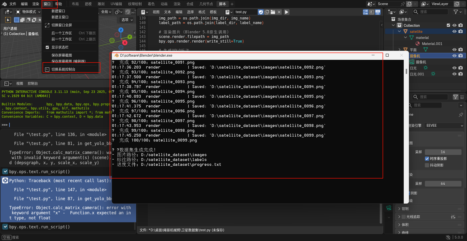 - 准备标注脚本:Blender 通过 Python 脚本实现批量渲染和自动标注,以下是适配卫星数据集的简化脚本,可直接复制到 Blender 脚本编辑器中,需修改脚本中模型名称、输出路径等参数。