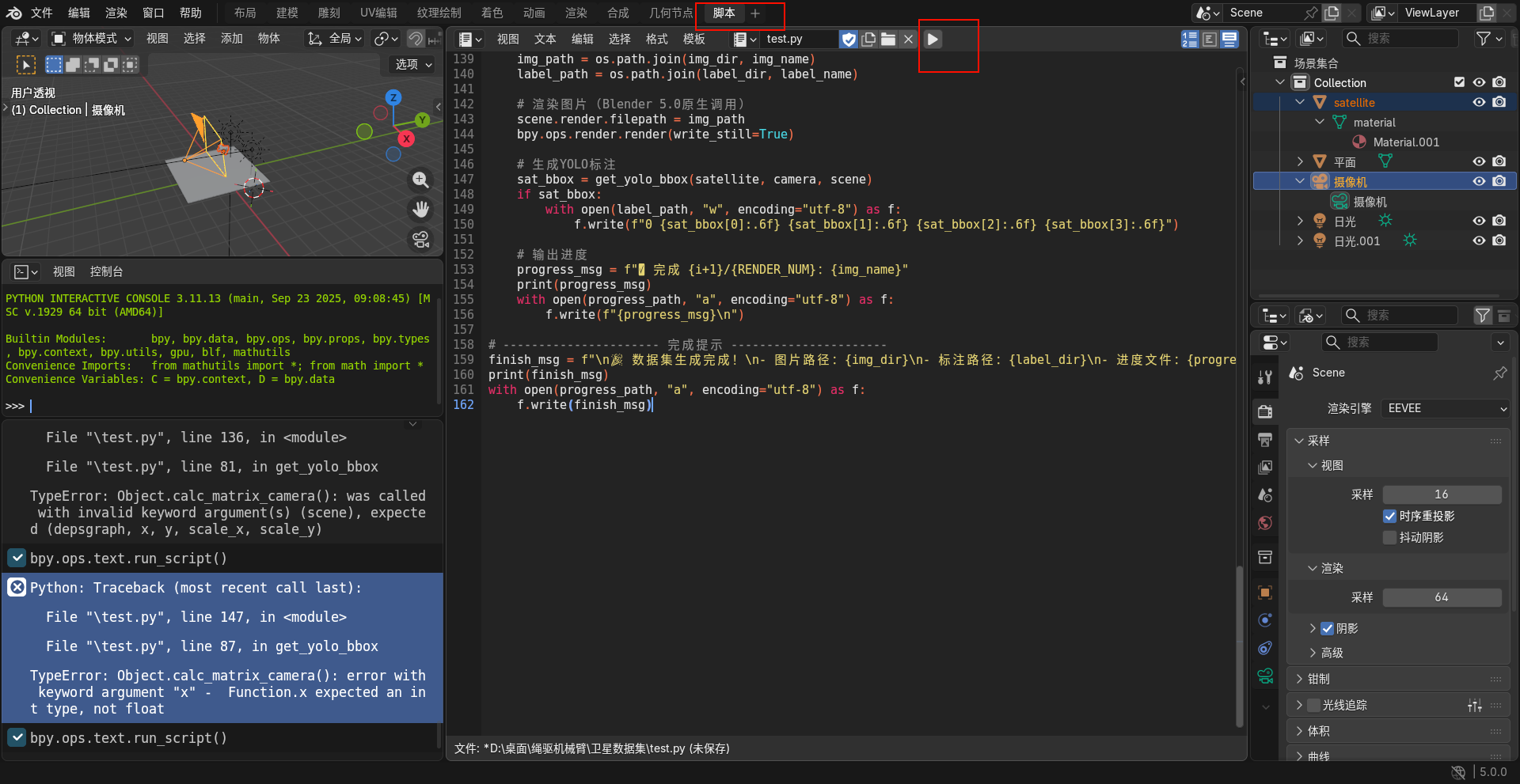 - 运行脚本:点击脚本窗口顶部的「运行脚本」按钮,Blender 会自动开始批量渲染。渲染过程中会在设置的输出路径下生成 images 和 labels 两个文件夹,分别存储卫星图像和对应的 YOLO 标注文件。