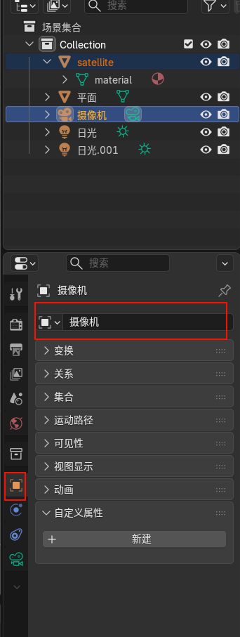 - 相机设置:Shift+A 键添加「相机」,创建一个空轴(Shift+A 键,选择「空物体」-「轴」),放置在卫星中心。按住 Shift 键先选相机再选轴,按 Ctrl+P 选择「对象(保持变换)」,将轴设为相机父级,后续旋转轴即可带动相机环绕卫星拍摄。