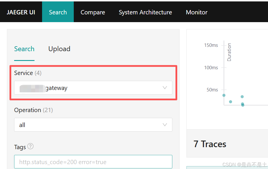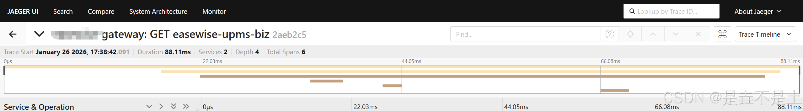 - 提供可视化 UI,支持按服务、操作、时间范围筛选链路,查看 Span 耗时、调用关系;