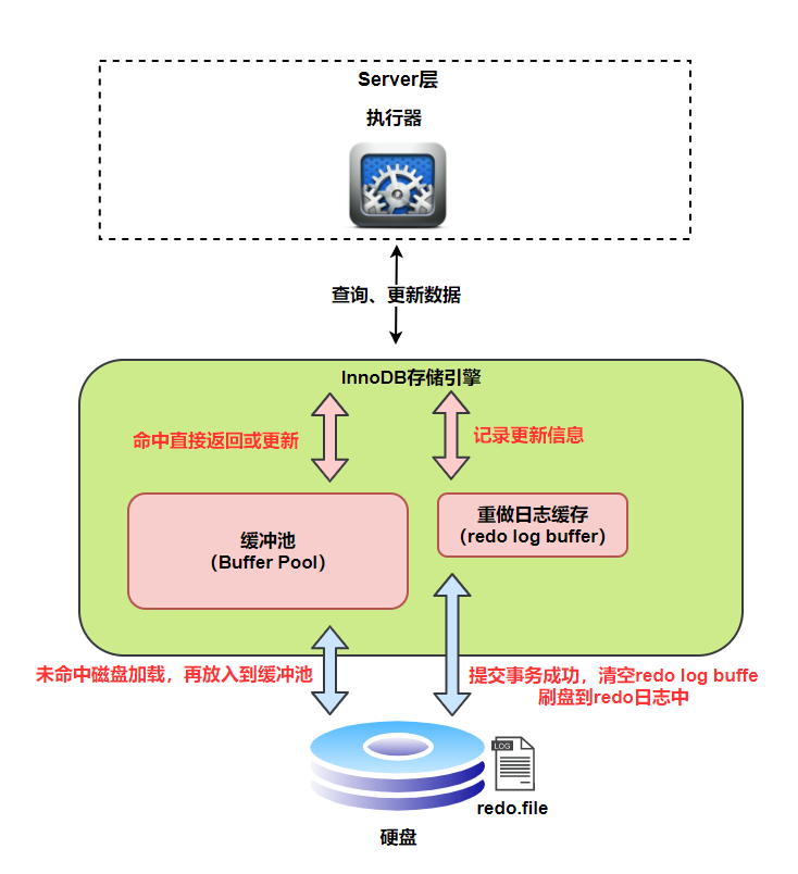 每当我们对表数据进行更新时,会把"在某个数据页上做了什么修改"记录到重做日志缓存(redo log buffer)里。