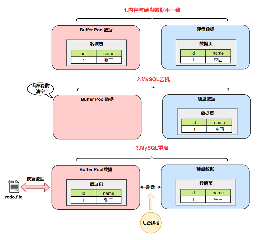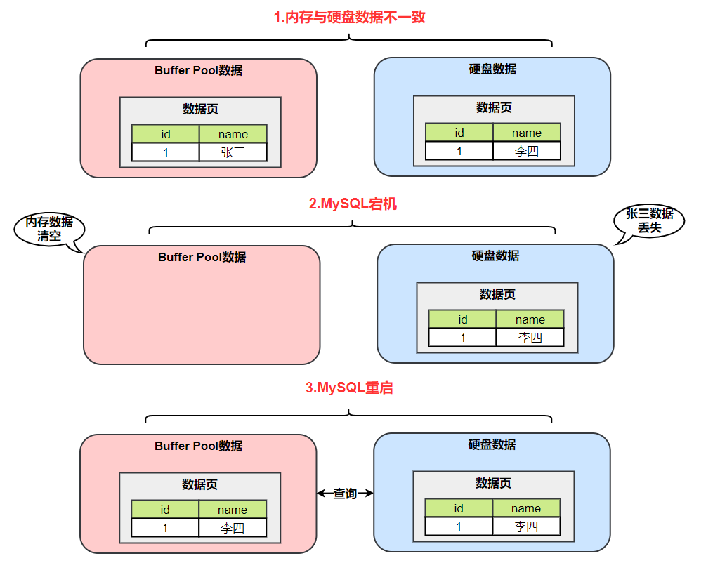 接着思考一个问题,假设我们把 Buffer Pool 中某个数据页的某条数据修改了,但是硬盘的数据还未同步,此时数据是不一致的,如果 MySQL 宕机了,数据就丢失了。