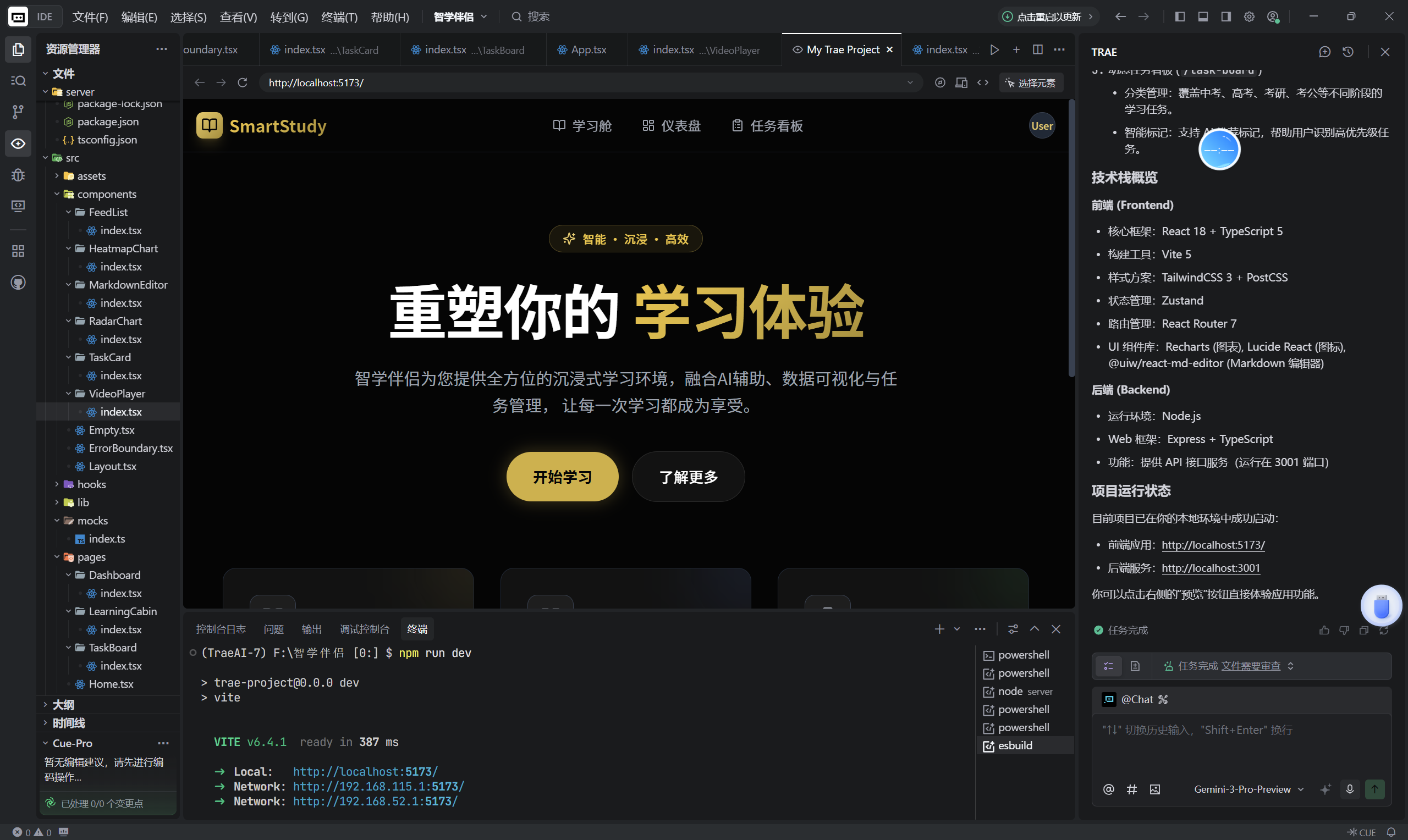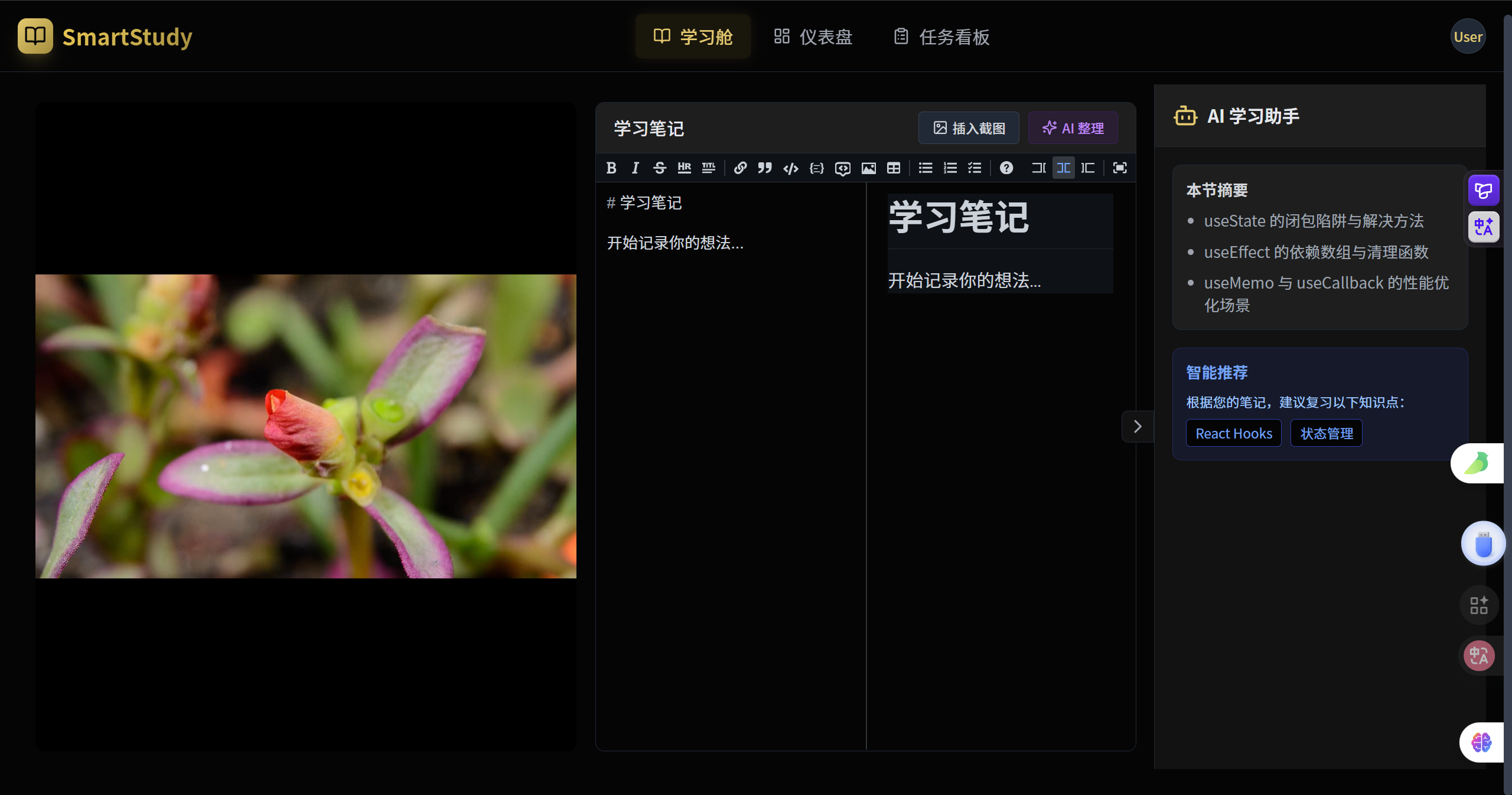 - 右侧笔记记录:集成 Markdown 编辑器,支持实时记录学习心得。