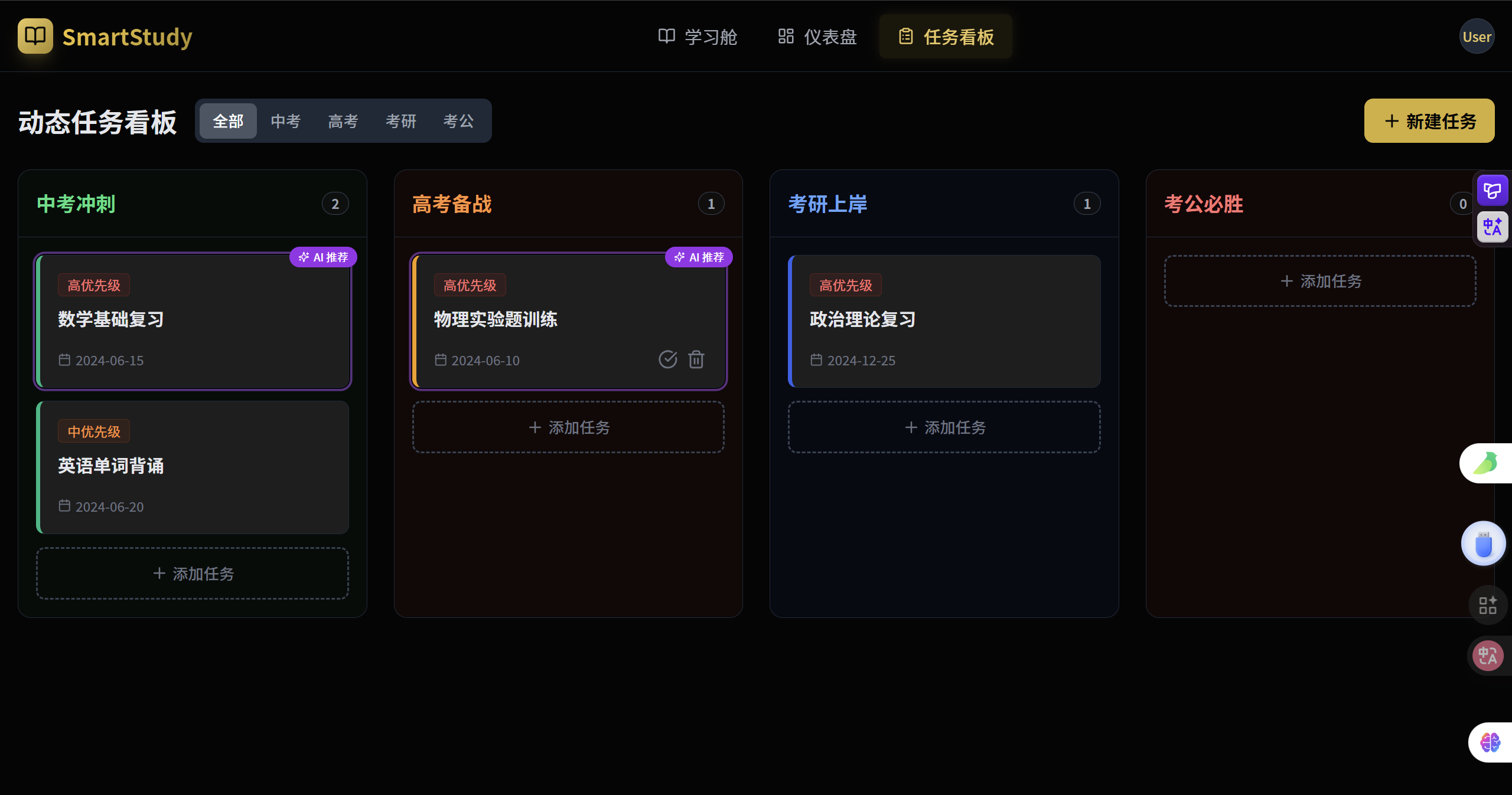 /task-board)- 分类管理:覆盖中考、高考、考研、考公等不同阶段的学习任务。