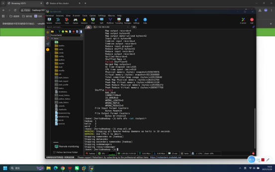 操作说明:测试完成后,在终端中执行Hadoop服务停止命令,关闭所有相关服务。