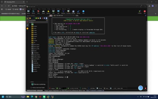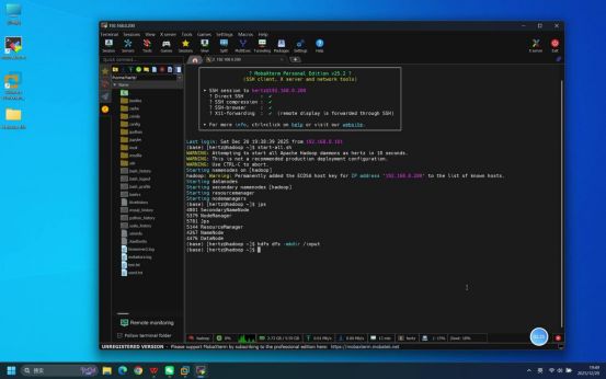 操作说明:打开本地Mobaxterm工具,按照伪分布式部署教程中的详细步骤建立与虚拟机的远程连接。