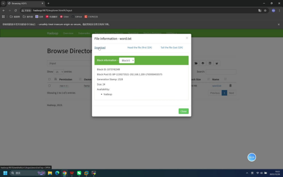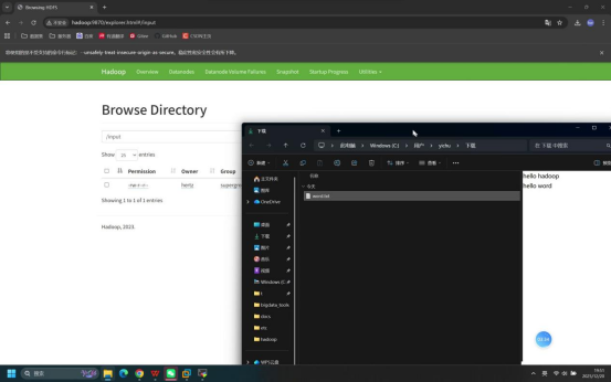操作说明:回到浏览器的HDFS WebUI页面,查看/input目录下是否新增word.txt文件,并下载该文件验证内容。
