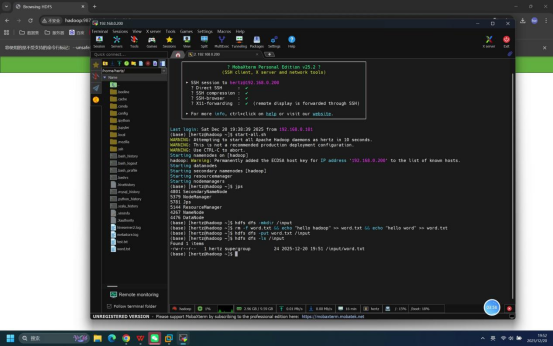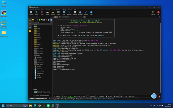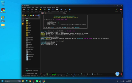 操作说明:在登录成功的Mobaxterm终端中,执行Hadoop服务启动命令,启动HDFS和YARN相关服务。