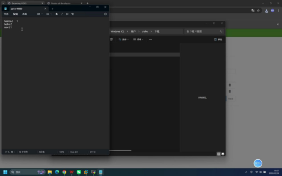 - 下载后的文件打开后,包含"hello hadoop"和"hello word"两行文本