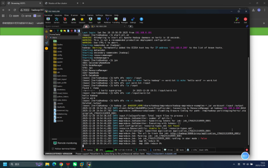 - 在HDFS WebUI中进入/output目录,确认显示part-r-00000等结果文件