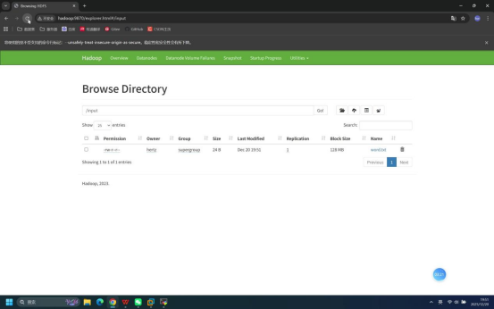 操作说明:打开本地浏览器,输入HDFS WebUI访问地址,查看刚创建的/input目录。