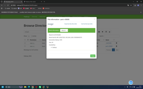 操作说明:回到浏览器的HDFS WebUI页面,进入/output目录,下载任务结果文件并打开验证内容。