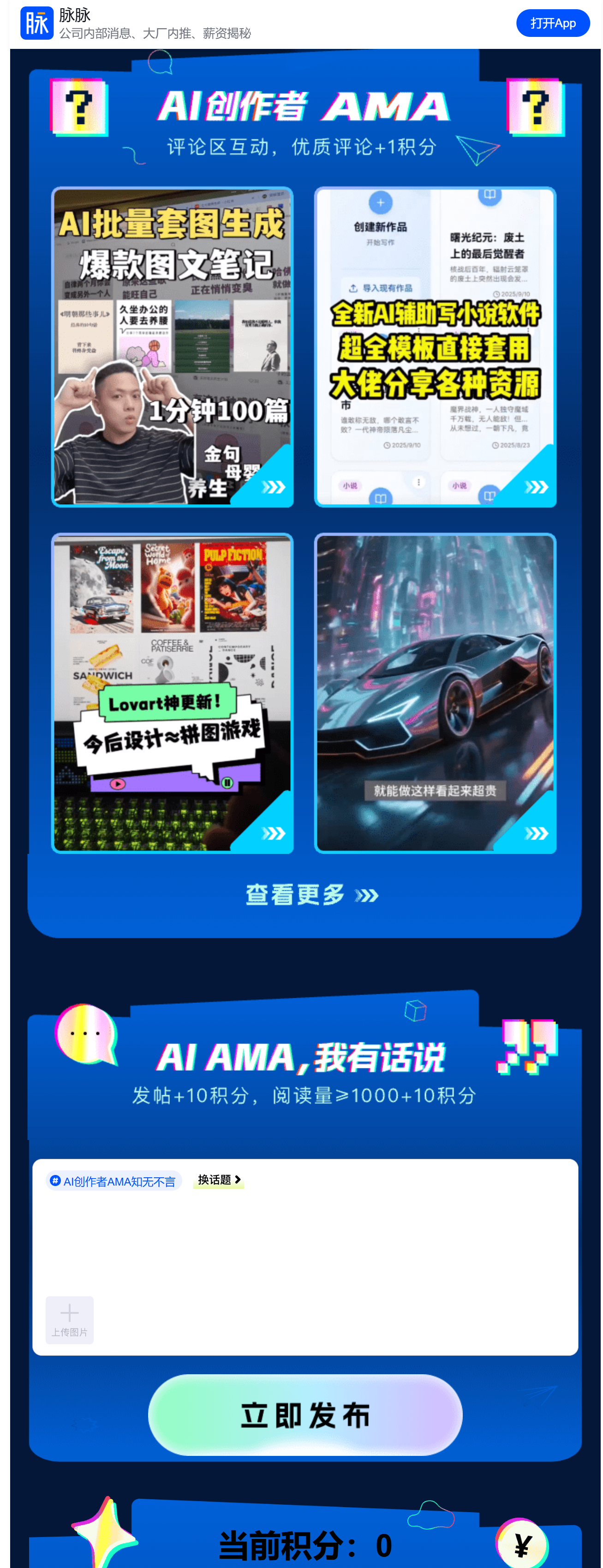 流量扶持:带「#AI 创作者 AMA 知无不言 #」话题的内容会获得优先推荐,优质内容可进入脉脉 "热榜""职言" 等核心板块,获得百万级曝光。