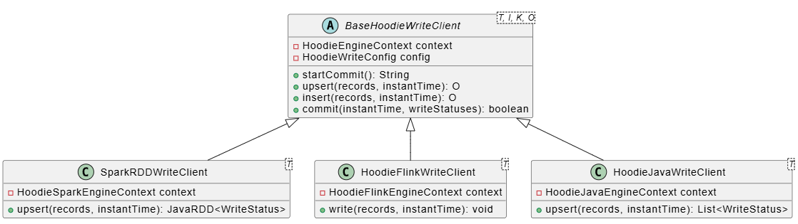 BaseHoodieWriteClient 是所有客户端的基类,定义了通用的写入逻辑。