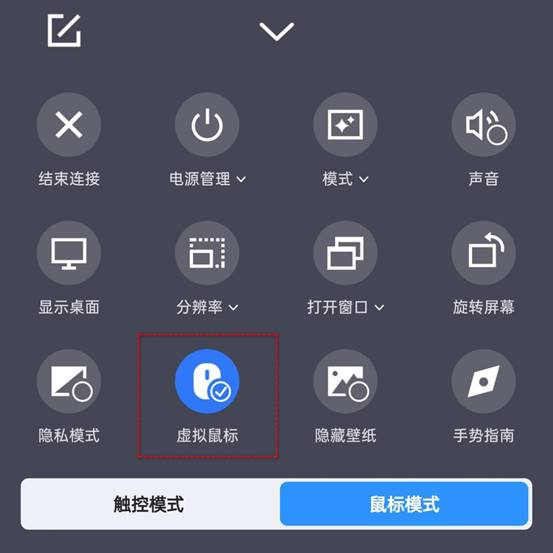 - 远程看看默认为手势模式 ,不用鼠标控制电脑,但也可点击右下角的"菜单 "按钮,单击勾选"虚拟鼠标"(或切换至鼠标模式)让手机模拟鼠标。