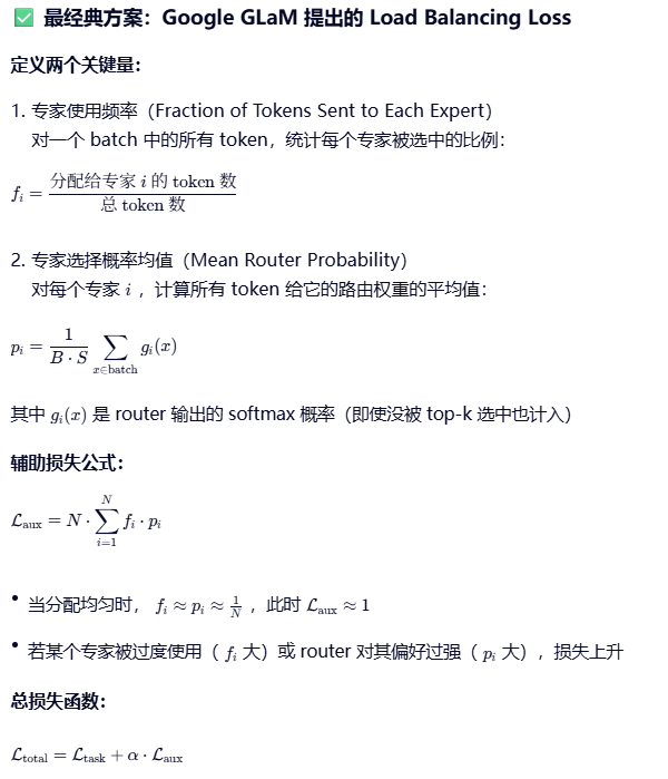 做法:主流是在损失函数中加入辅助损失(Auxiliary Loss),显式鼓励 router 均匀分配 token。