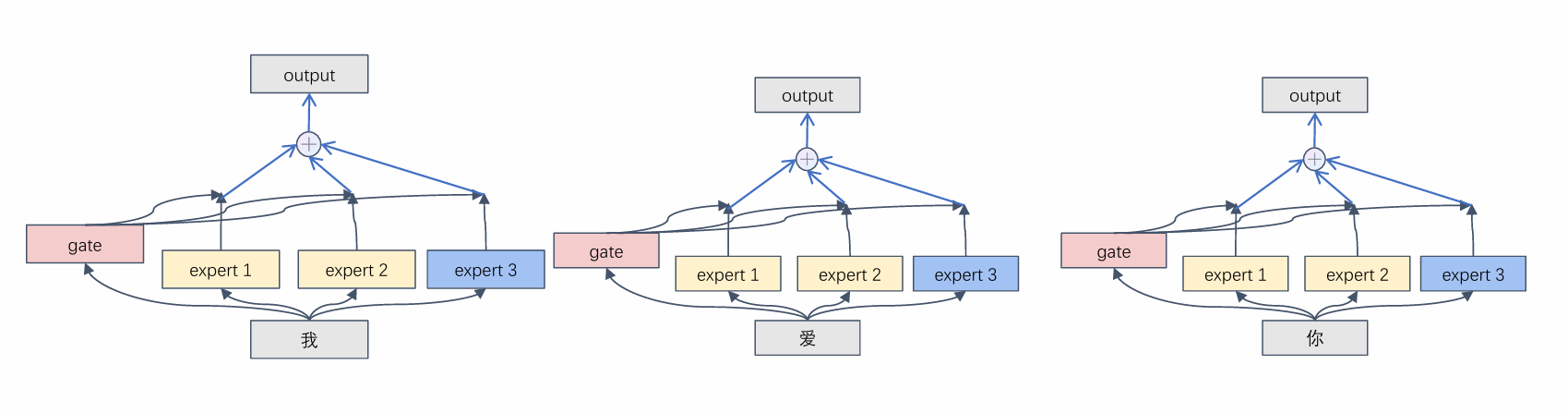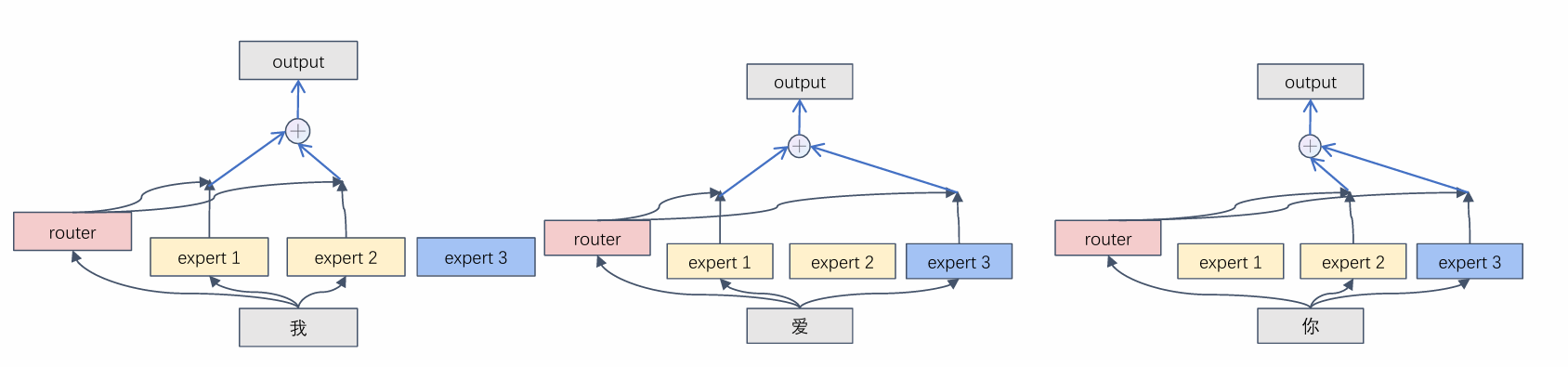 只激活 top-k 个专家(通常 k=1 或 2),其余专家完全不参与计算。