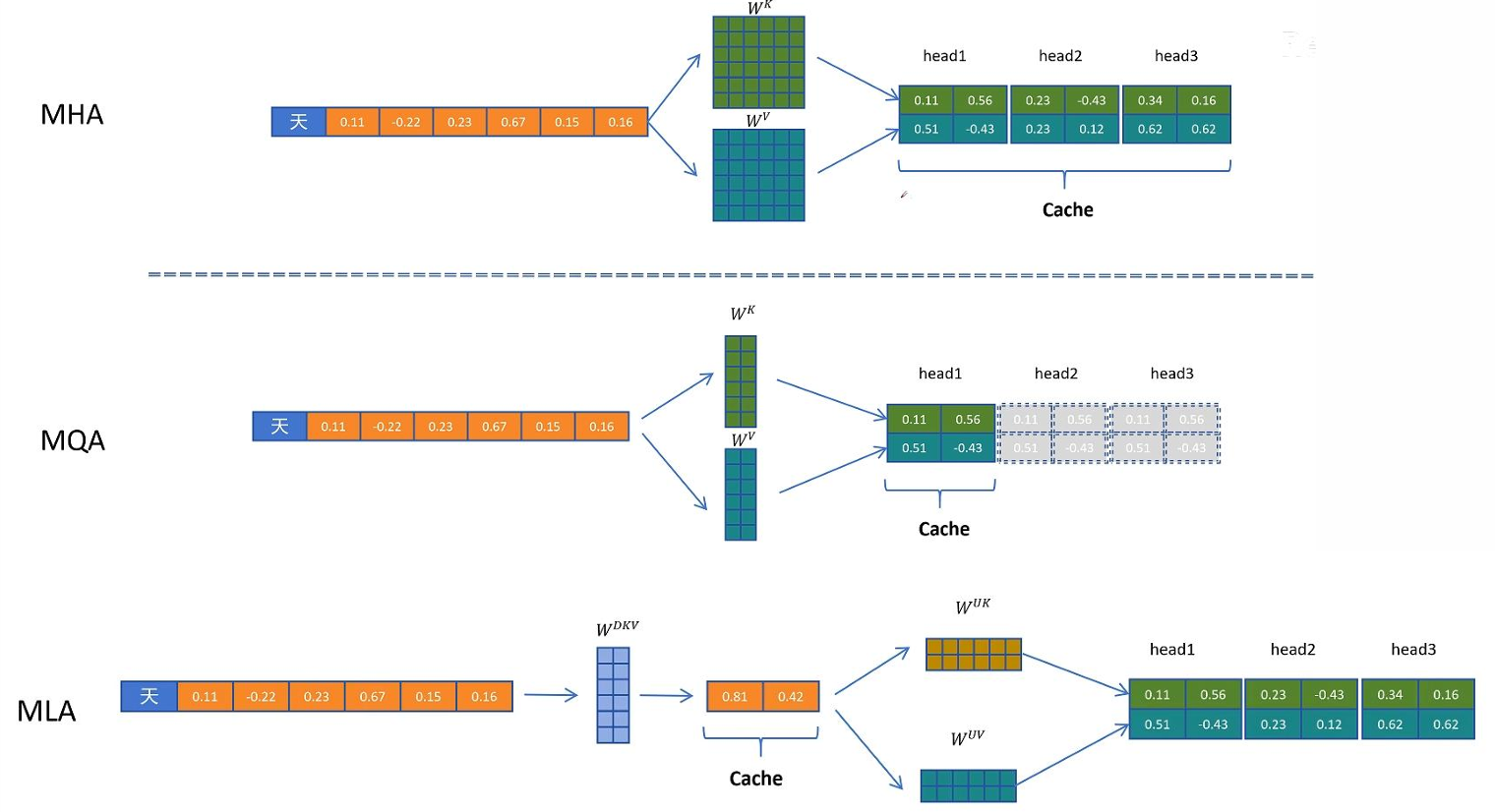 对于MLA:W_dkv是一个低秩矩阵,只需要存C_kv,需要求K,V的时候就拿C_kv做计算得到K,V