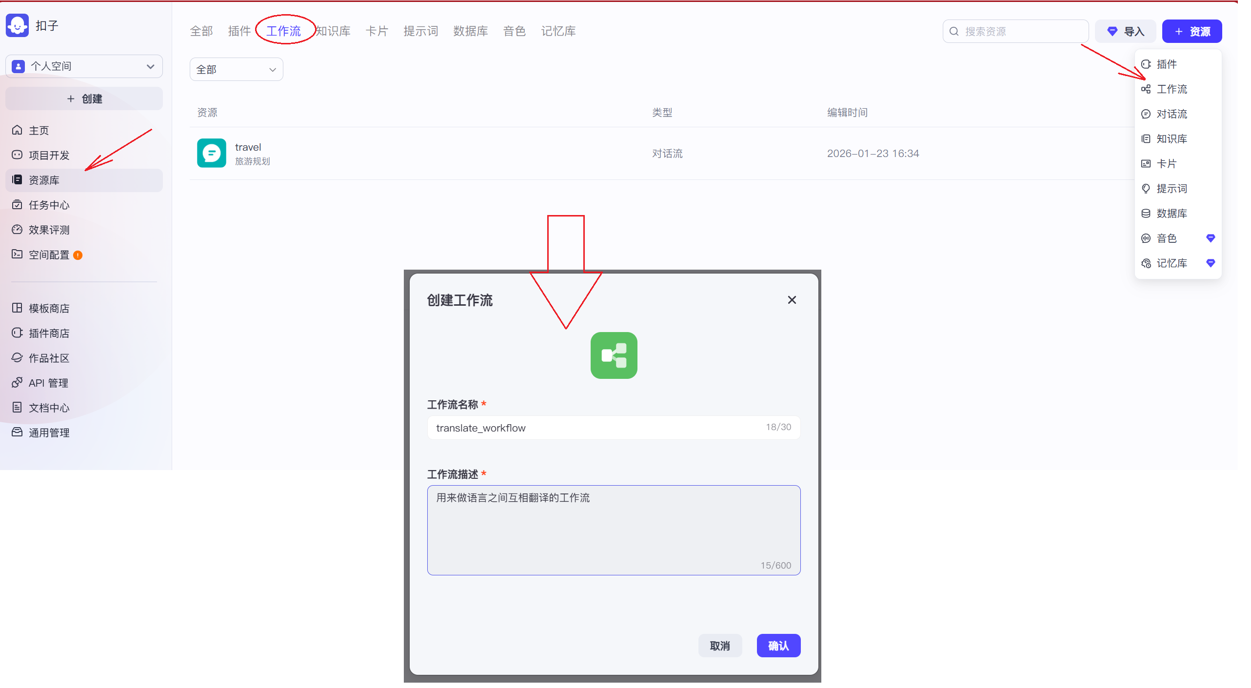 - 扣⼦开发平台 :如同餐厅的菜谱研发部⻔,负责设计新菜品(智能体功能)、制定烹饪流程(⼯作
