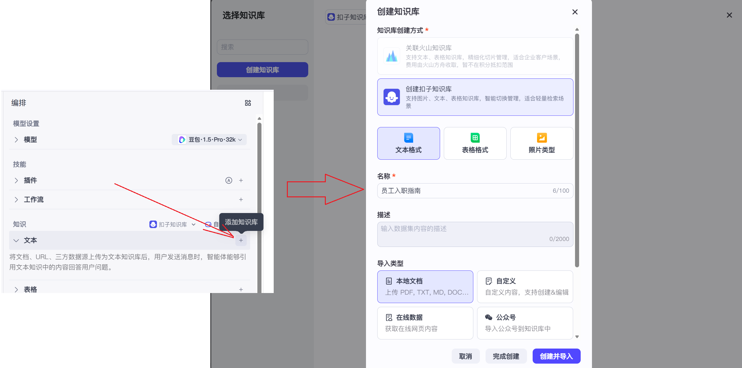 新创建智能体,并把数据导入知识库,再把知识库的内容导入到智能体中。