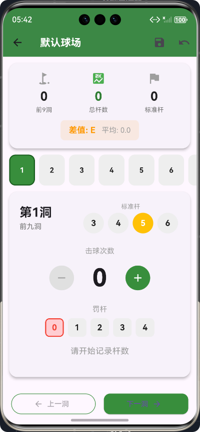 杆数记录功能:这是应用的核心功能,用户可以通过简洁的界面快速记录每一洞的击球次数和罚杆次数。应用提供了直观的计数器界面,用户只需点击加号或减号按钮即可调整杆数。系统会自动计算总杆数(击球次数+罚杆数)并与标准杆进行对比。