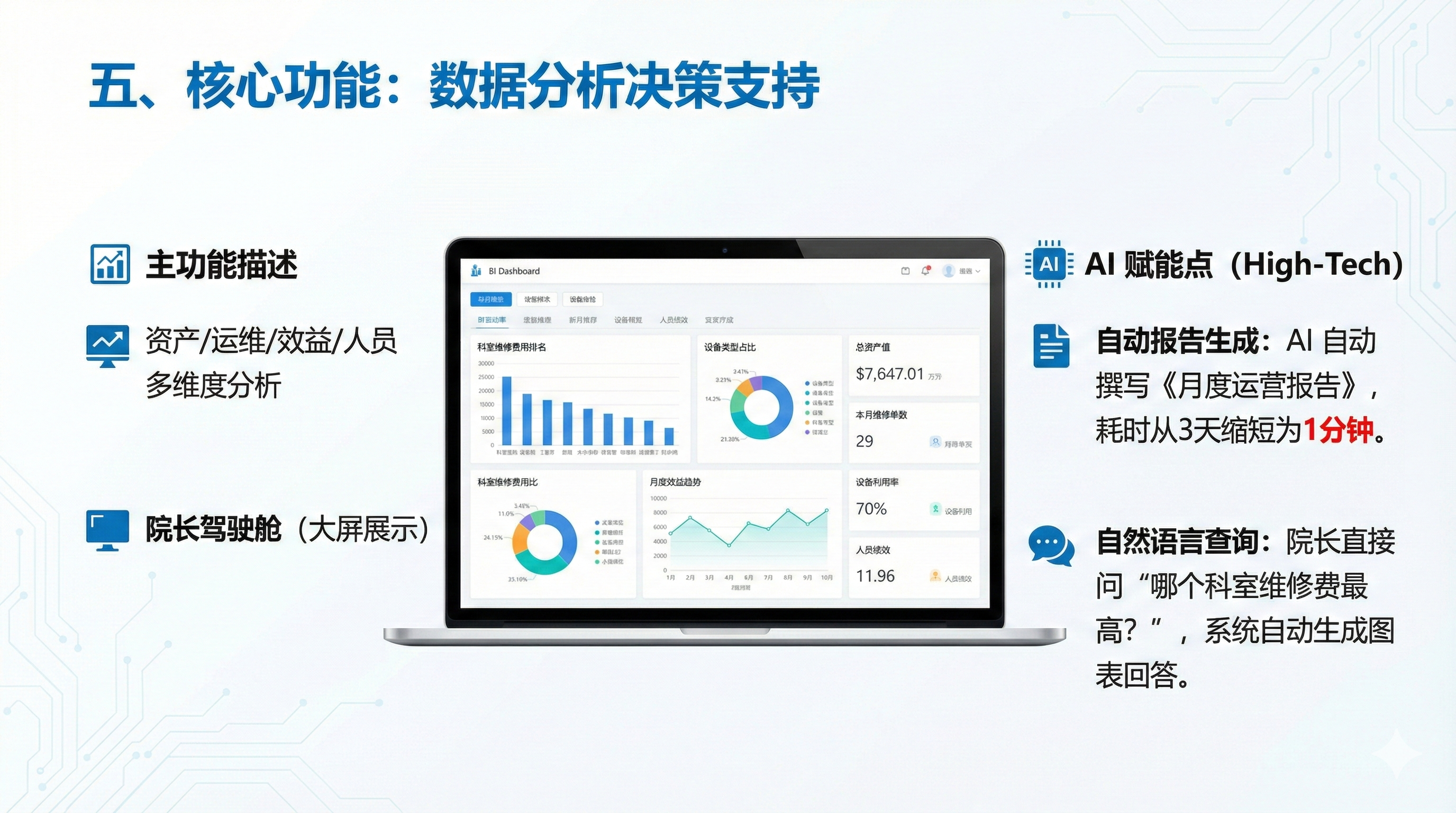 > - **自然语言查询**:院长直接问"哪个科室维修费最高?",系统自动生成图表回答。