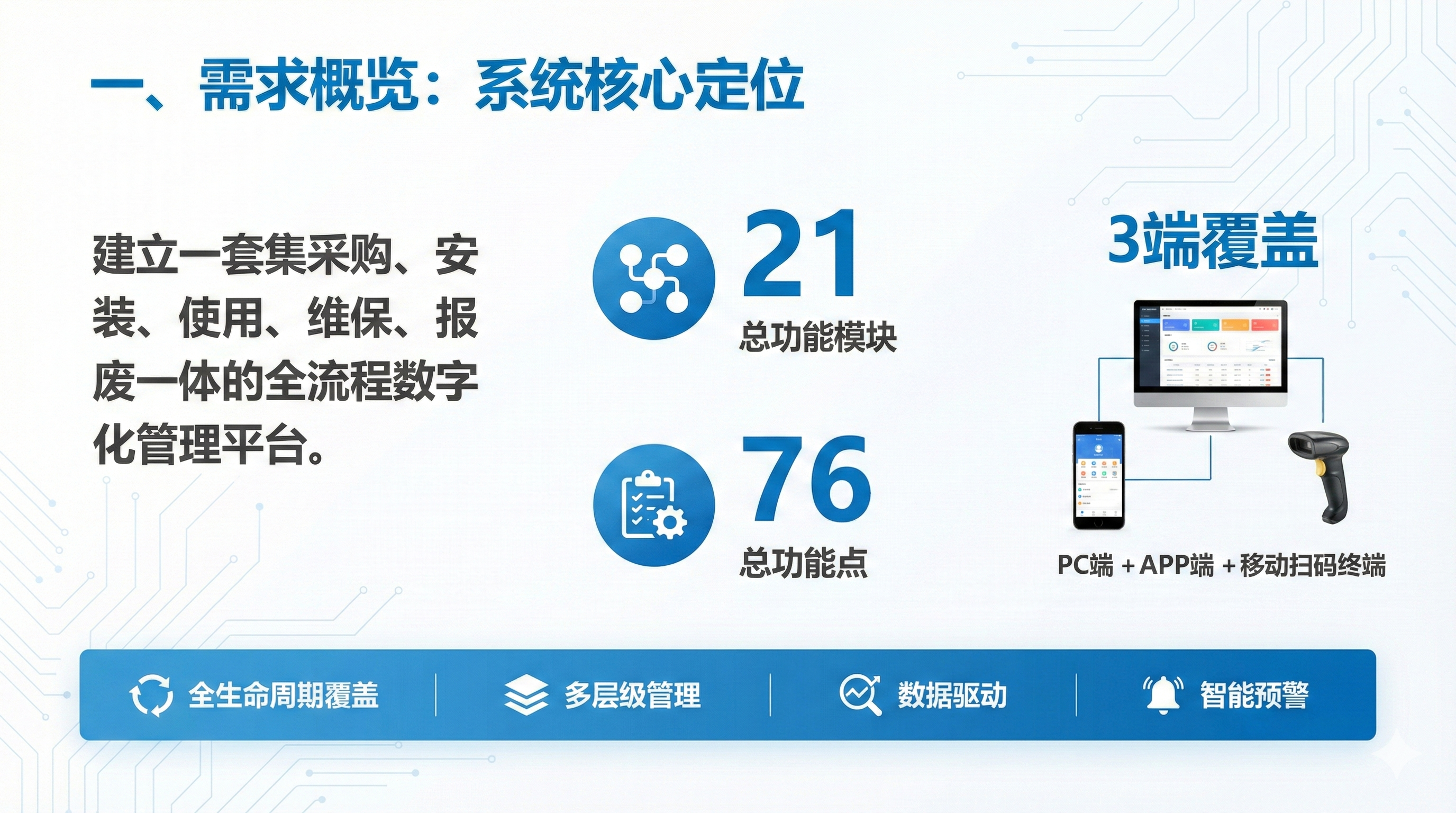 * *流程流向:采购 -> 安装 -> 资产使用 -> (维修/保养/巡检) -> 报废。*