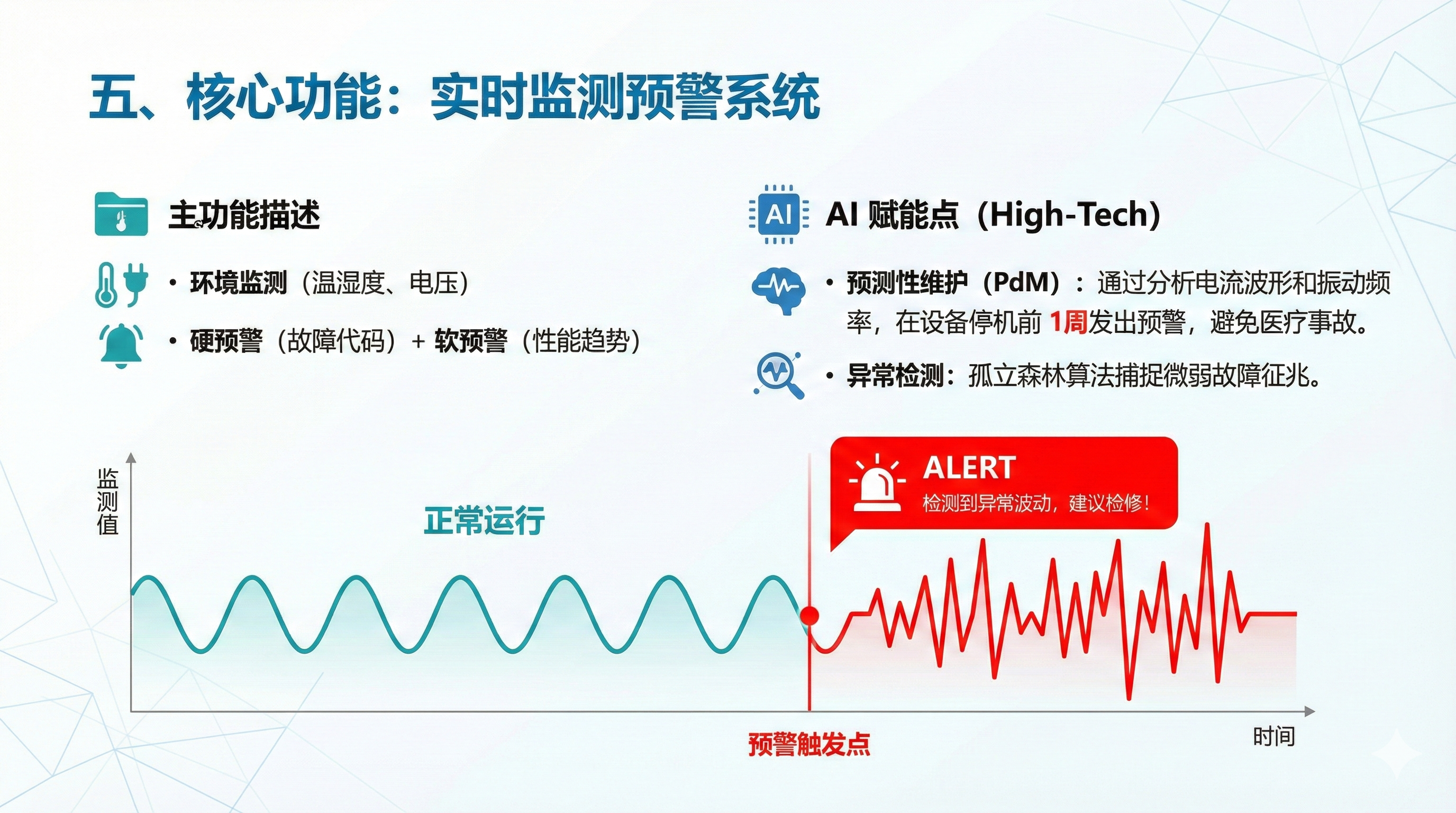 > - **预测性维护 (PdM)**:通过分析电流波形和振动频率,在设备停机前 **1周** 发出预警,避免医疗事故。