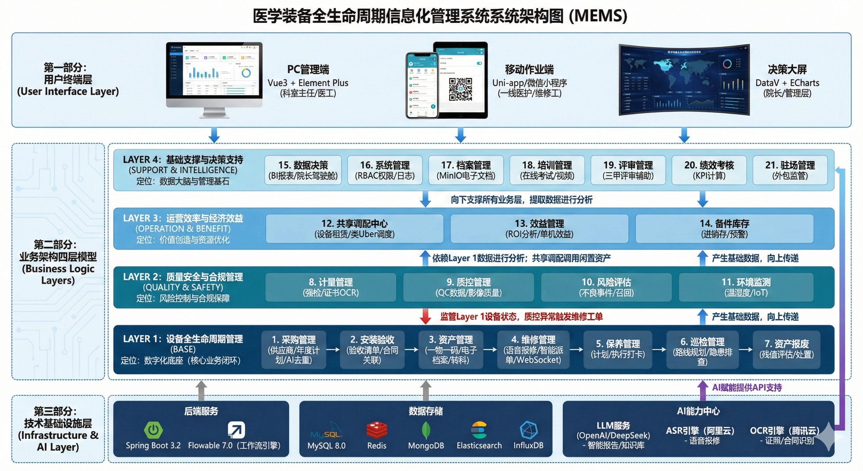请生成一张专业的"医学装备全生命周期信息化管理系统"的系统架构图。