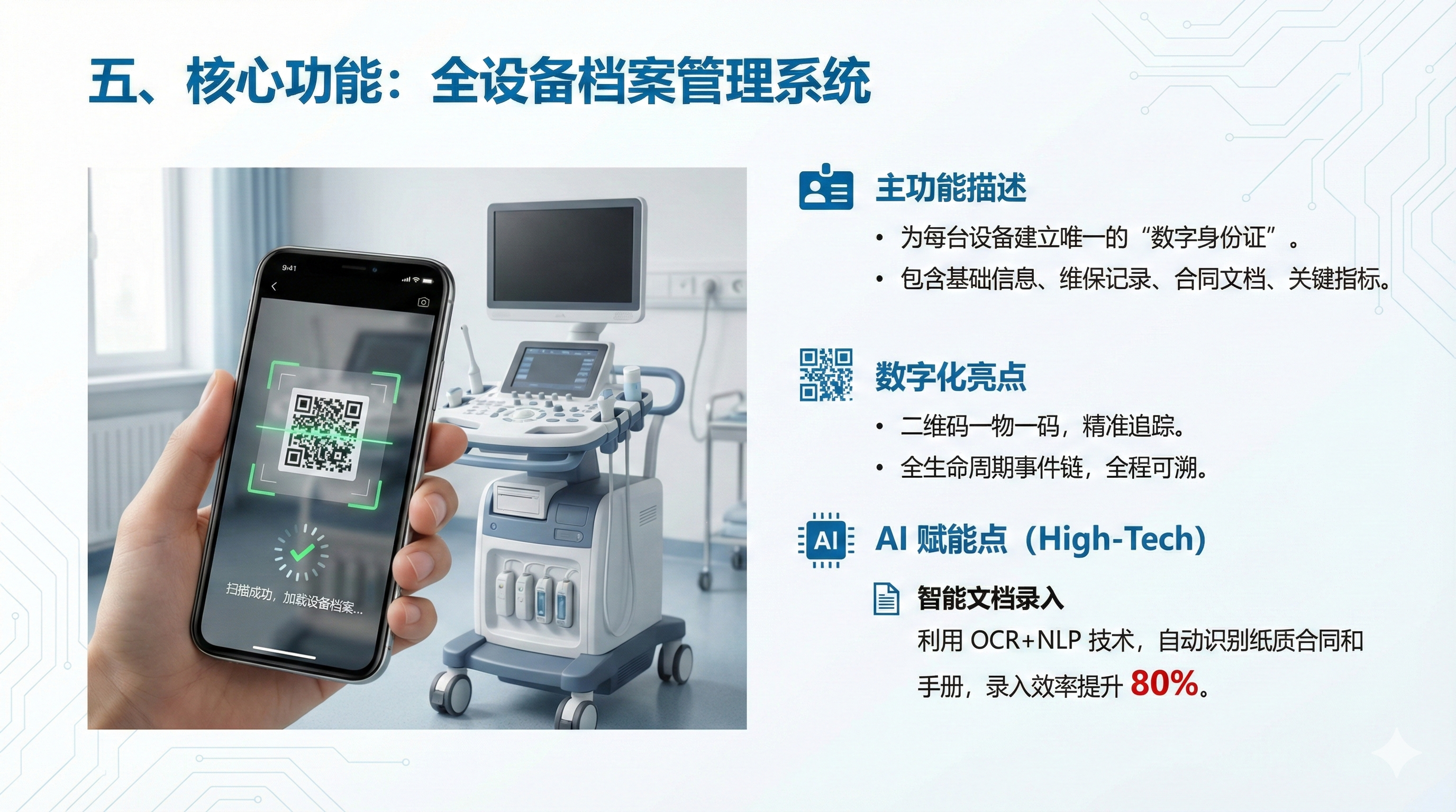 > **视觉建议**:左侧放一个手机扫描设备二维码的示意图,右侧列出功能点和AI赋能优势。