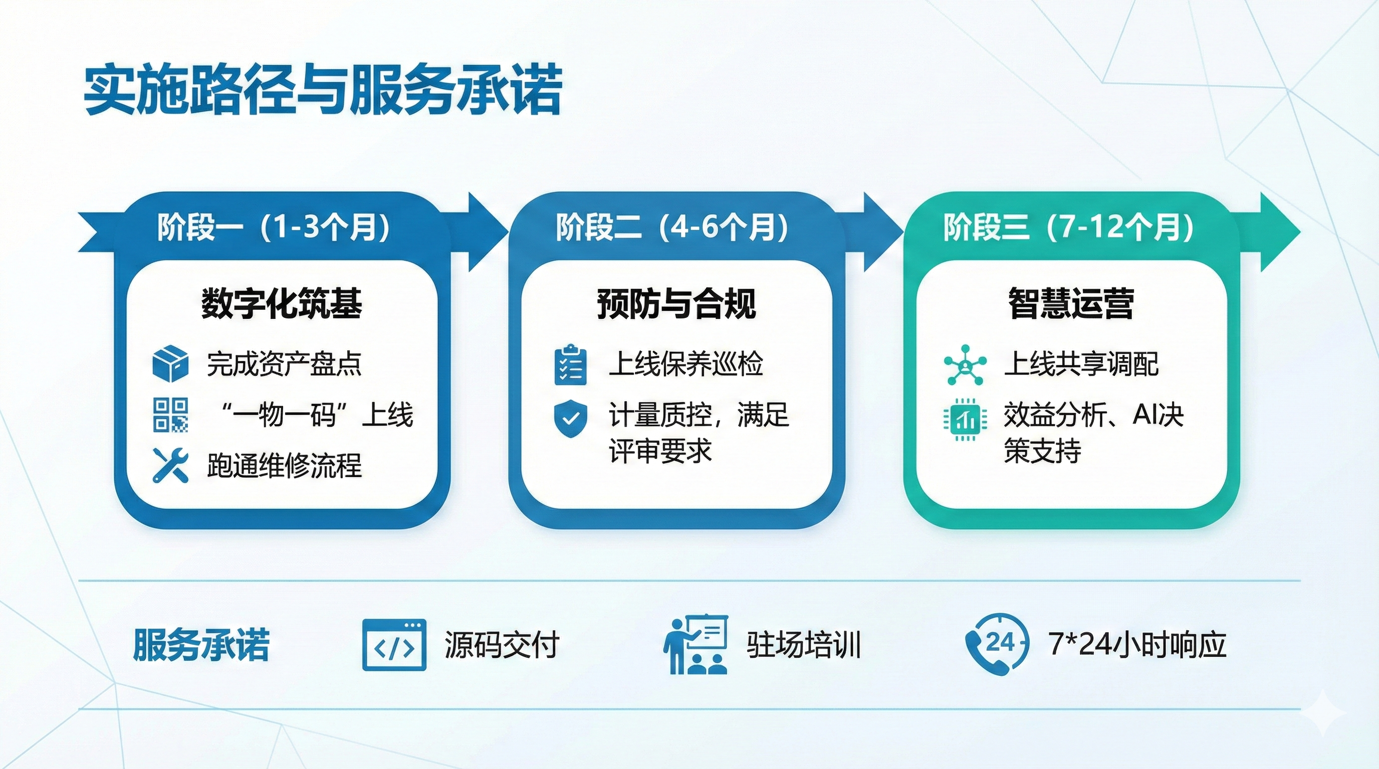 > 1. **阶段一(1-3个月)**:数字化筑基。完成资产盘点,"一物一码"上线,跑通维修流程。